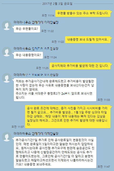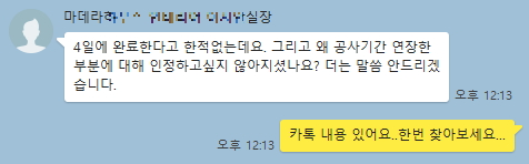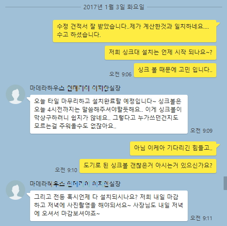 막판에 살짝 공사 지연이 있지만 톡 내용으로 볼땐 이사날 아침까진 완료해 준다는줄 알았습니다..